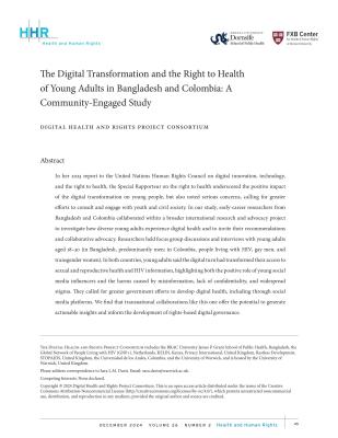 In her 2023 report to the United Nations Human Rights Council on digital innovation, technology, and the right to health, the Special Rapporteur on the right to health underscored the positive impact of the digital transformation on young people, but also noted serious concerns, calling for greater efforts to consult and engage with youth and civil society. In our study, early-career researchers from Bangladesh and Colombia collaborated within a broader international research and advocacy project to investigate how diverse young adults experience digital health and to invite their recommendations and collaborative advocacy. Researchers held focus group discussions and interviews with young adults aged 18–30 (in Bangladesh, predominantly men; in Colombia, people living with HIV, gay men, and transgender women). In both countries, young adults said the digital turn had transformed their access to sexual and reproductive health and HIV information, highlighting both the positive role of young social media influencers and the harms caused by misinformation, lack of confidentiality, and widespread stigma. They called for greater government efforts to develop digital health, including through social media platforms. We find that transnational collaborations like this one offer the potential to generate actionable insights and inform the development of rights-based digital governance.