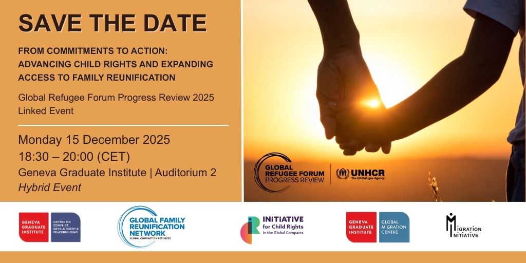 The event is a collaboration between the Geneva Graduate Institute for International and Development Studies (IHEID) Centre for Conflict, Development and Peacebuilding (CCDP), the Global Family Reunification Network (FRUN), the Initiative for Child Rights in the Global Compacts, and the IHEID Global Migration Centre- Migration Initiative.