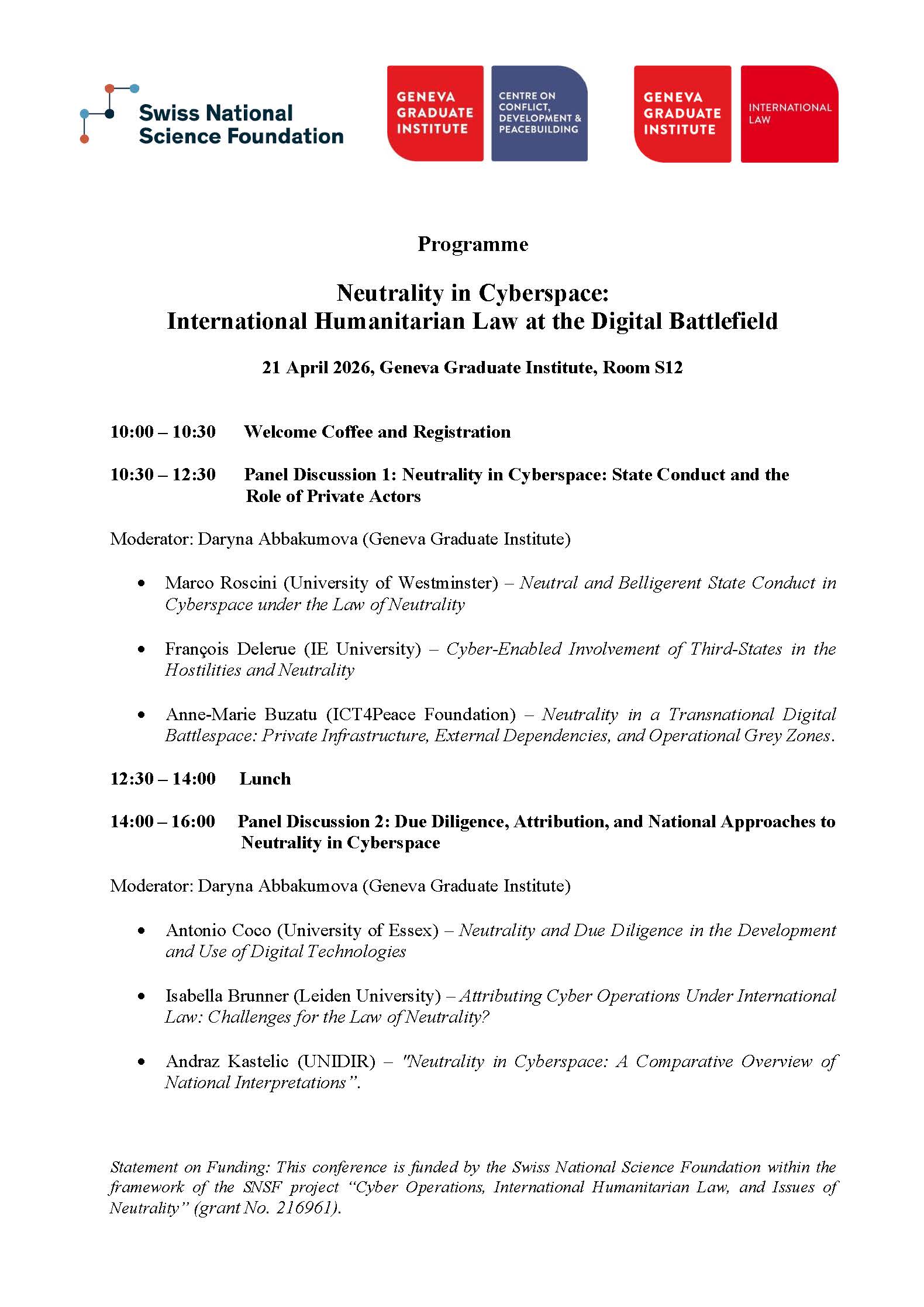 This event is organised with the generous support of the Swiss National Science Foundation and is part of the SNSF project “Cyber Operations, International Humanitarian Law, and Issues of Neutrality” (grant No. 216961).