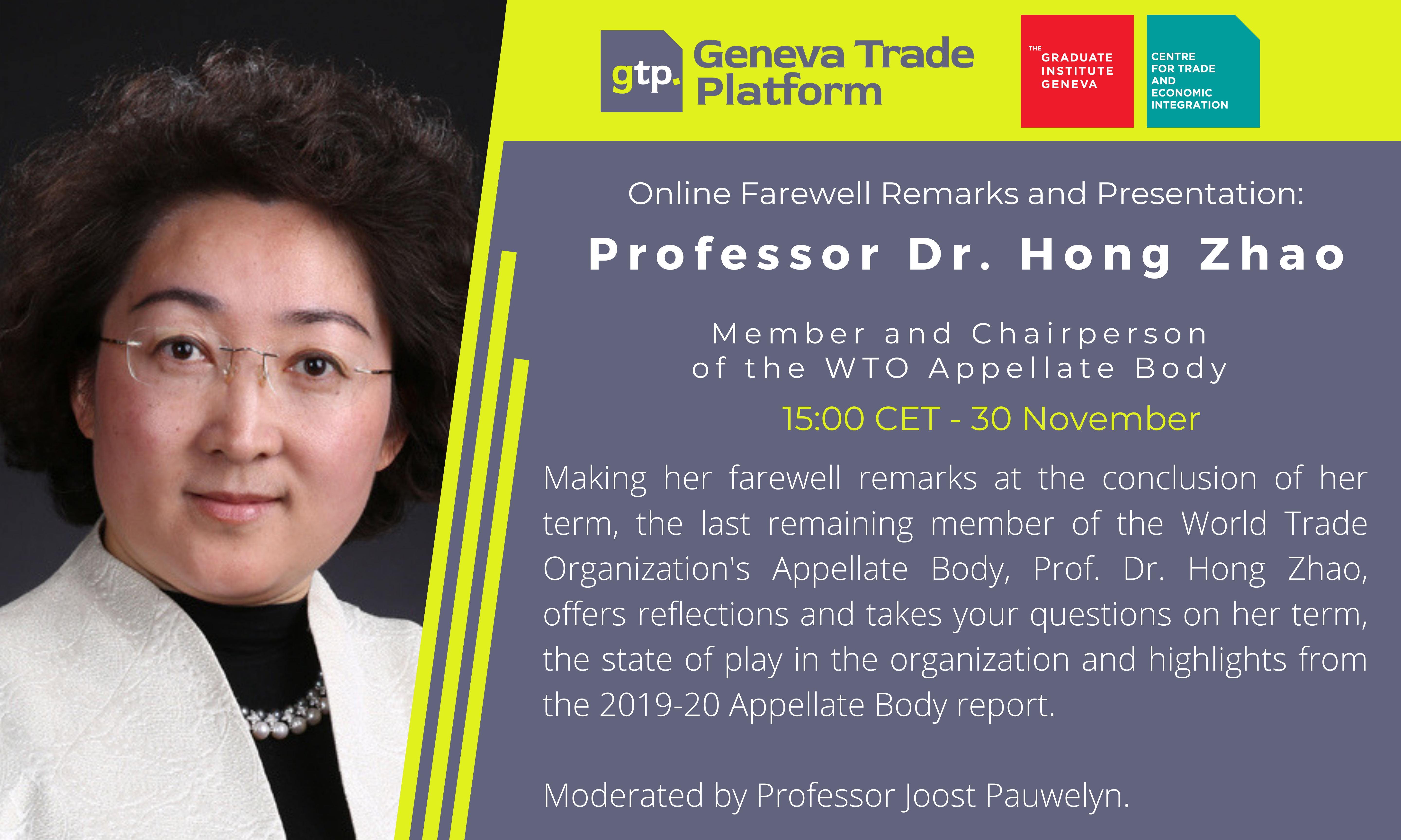 Professor Dr. Hong Zhao is the Chairperson and final Member of the World Trade Organization's Appellate Body. On Monday 30 November, she joins the Geneva Trade Platform to offer her farewell remarks at the conclusion of her term.