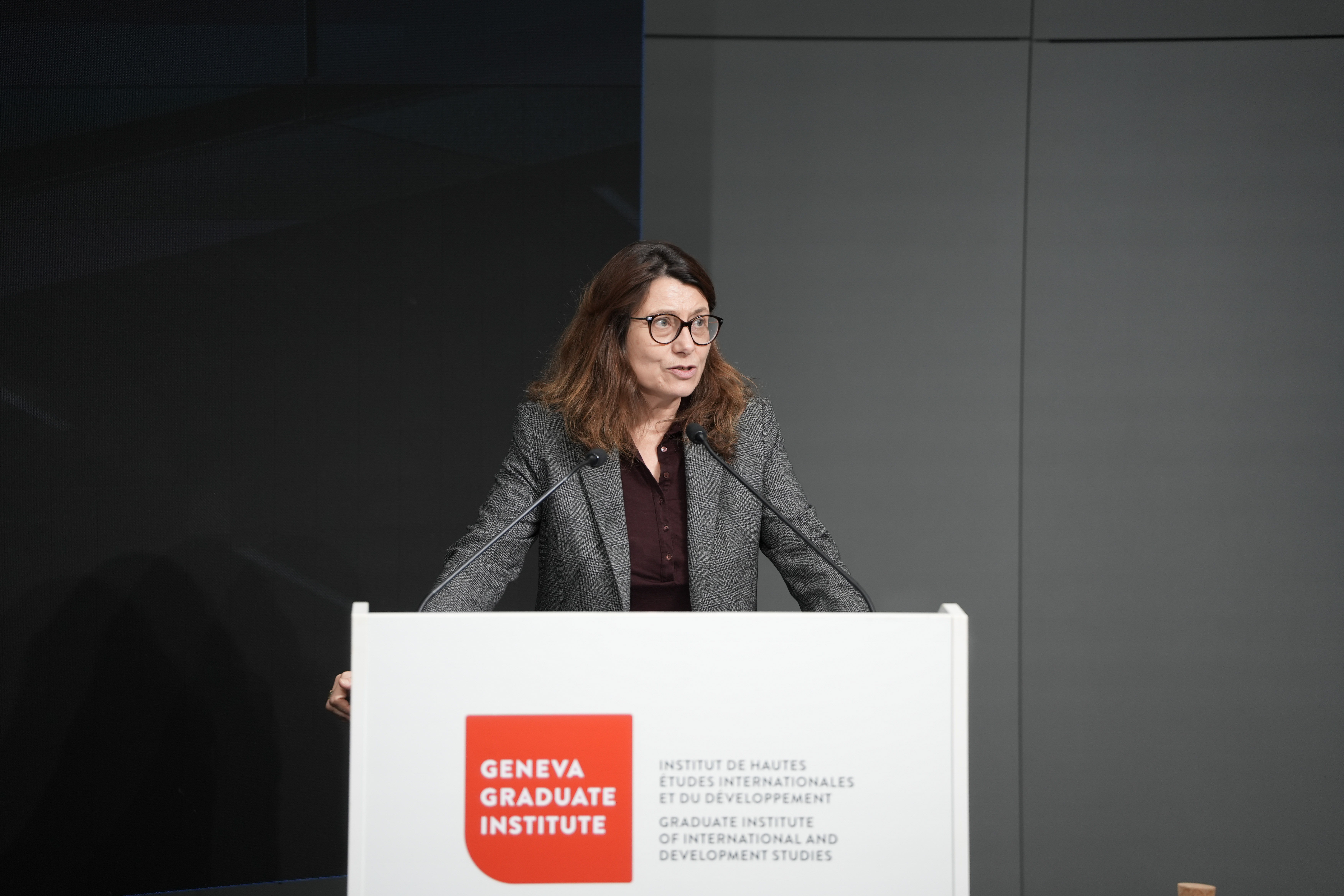 Marie-Laure Salles, Director of the Geneva Graduate Institute, introduced the event by underlining the importance of “understanding how conflicts shape information and media landscapes in different geographical contexts”. Drawing on Marc Bloch’s analysis of false news during wartime, she emphasized that the spread of fake news stems less from factual inaccuracies than from the strength of collective emotions. Technology plays a double role in that context – it can increase and facilitate access to information but it also tends to reinforce the polarization of collective emotions and representations. Marie-Laure Salles dedicated the evening to the 220 journalists who have been killed in Gaza since October 7, 2023.