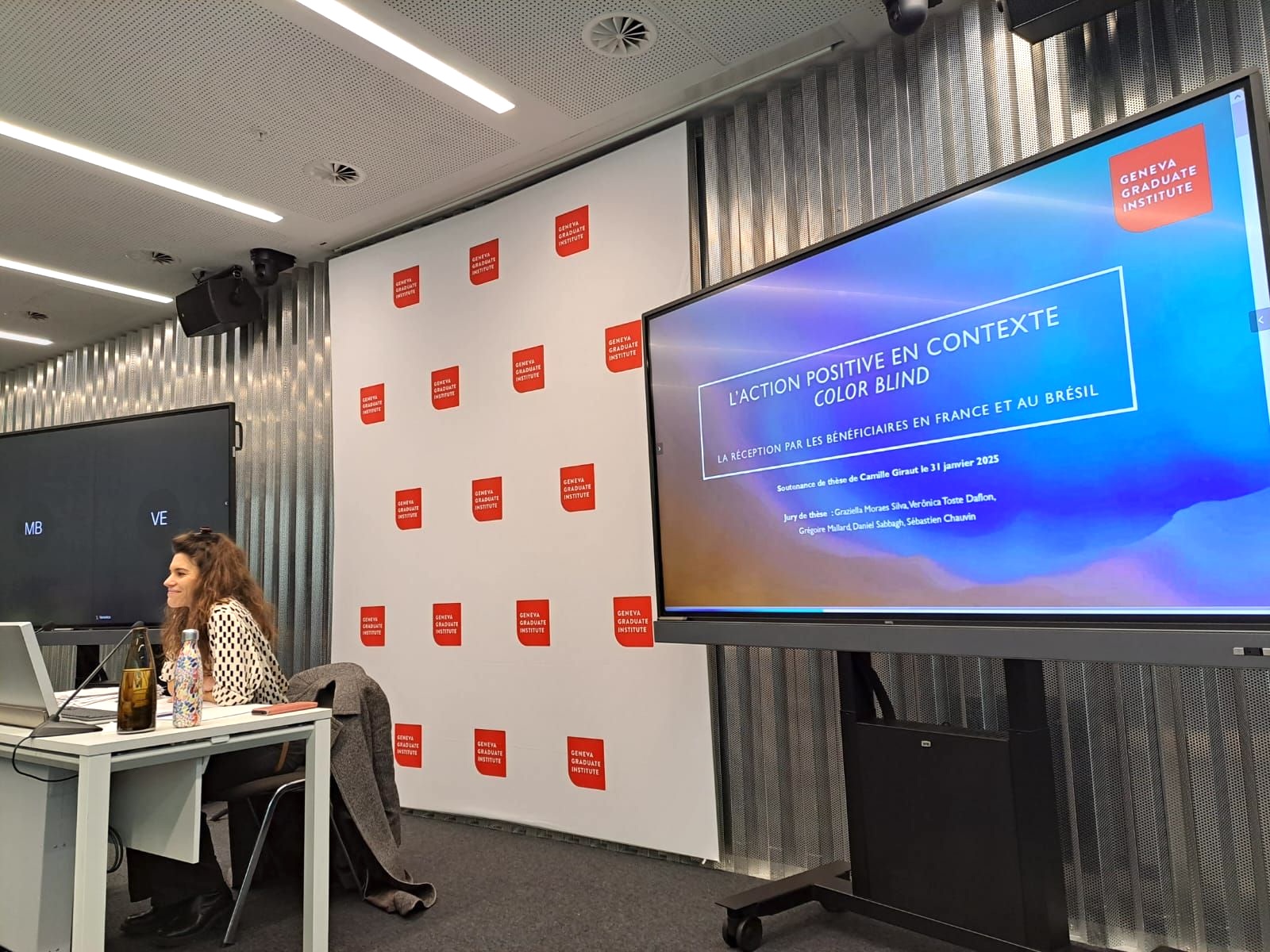 Camille Giraut a soutenu sa thèse de doctorat, intitulée « L’action positive en contextes color blind : la réception par les bénéficiaires en France et au Brésil », le 31 janvier 2025 devant un jury présidé par Grégoire Mallard, professeur d’anthropologie et de sociologie et relecteur interne, et composé de Graziella Moraes Dias Da Silva, professeure adjointe d’anthropologie et de sociologie et codirectrice de thèse, Verônica Toste Daflon, professeure assistante au Département de sociologie de l’Université fédérale Fluminense, au Brésil, et codirectrice de thèse, Daniel Sabbagh, directeur de recherche à Sciences Po, Paris, et relecteur externe, et Sébastien Chauvin, professeur associé à l’Université de Lausanne et relecteur externe.