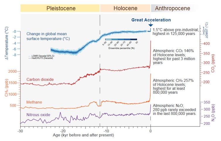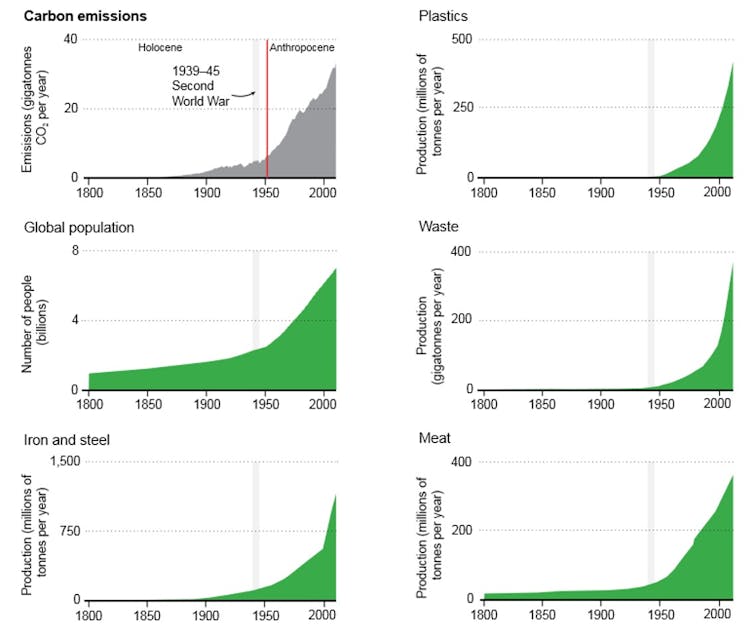 Les dates précédemment évoquées sont des signes avant-coureurs d’une croissance exponentielle de notre impact, dont on retrouve les traces indubitables dans notre environnement et les enregistrements géologiques après la Seconde Guerre mondiale. Quel que soit le paramètre envisagé (composition de l’atmosphère, températures, cycle du carbone, impacts sur la biodiversité, modifications du cycle de l’eau, explosion de la production alimentaire et du tourisme, développement de la consommation de biens matériels…) l’évolution montre une rupture majeure à partir des années 1950, et des taux de progression actuels que rien ne semble pouvoir enrayer.