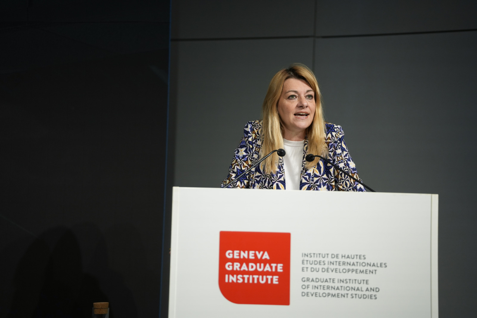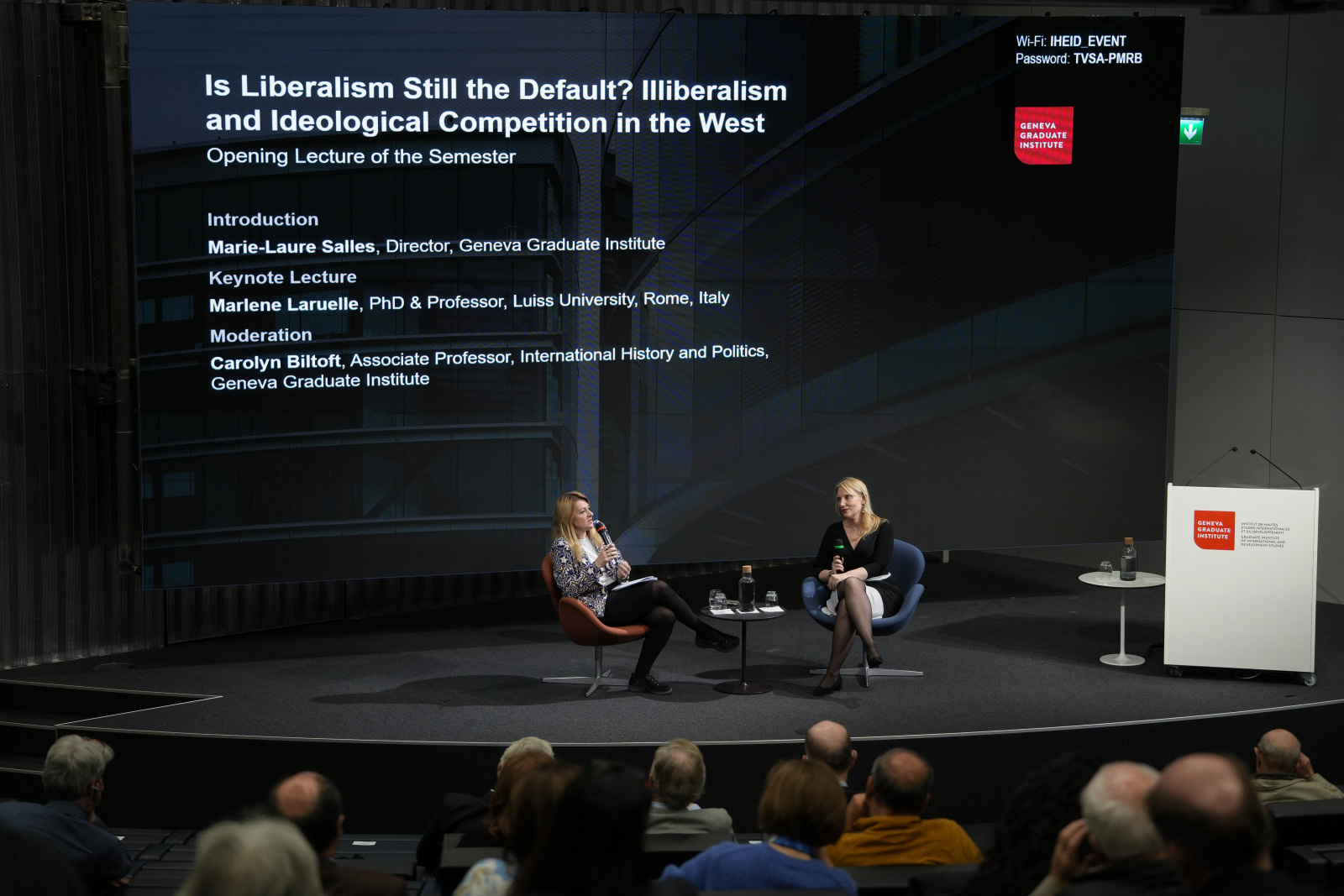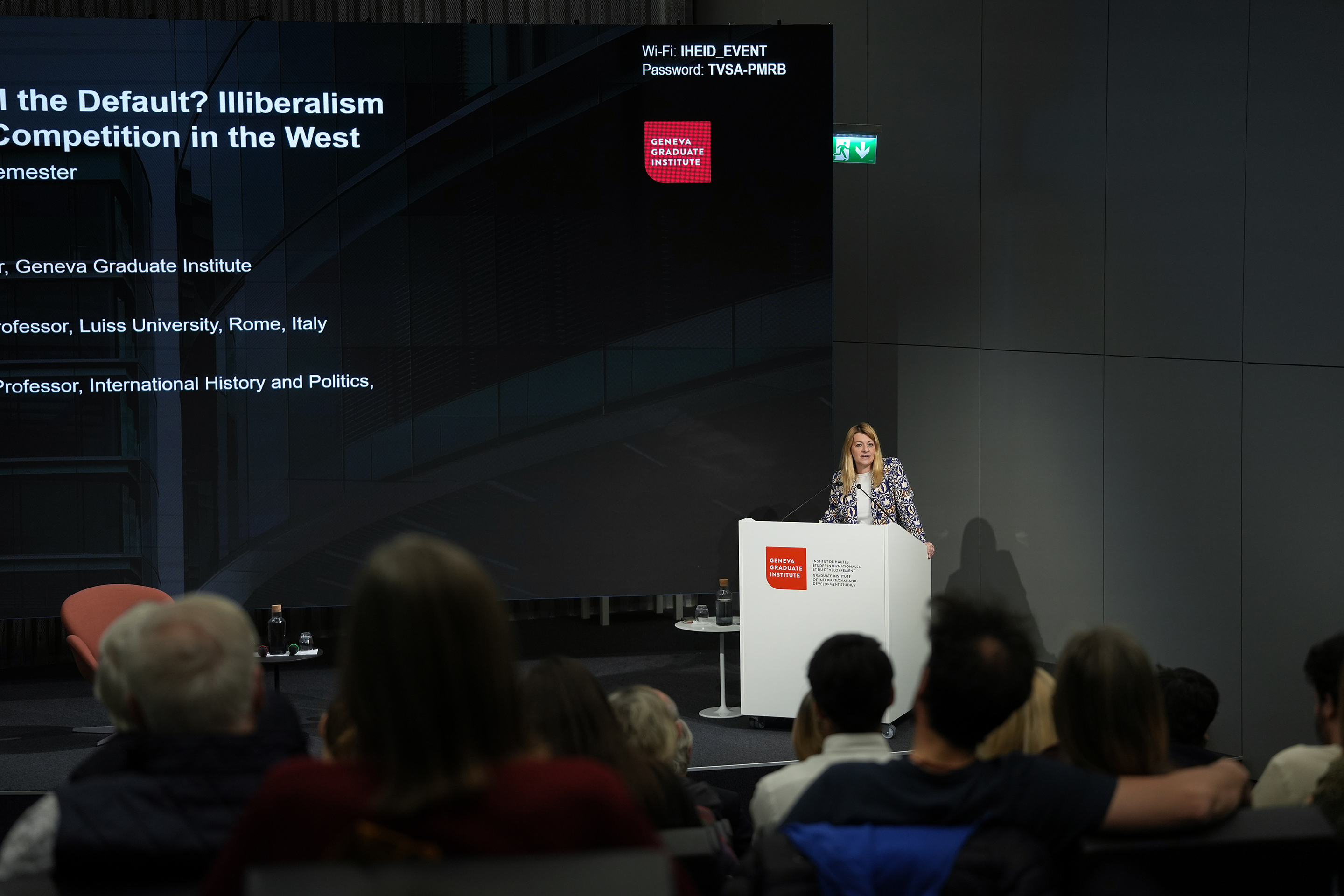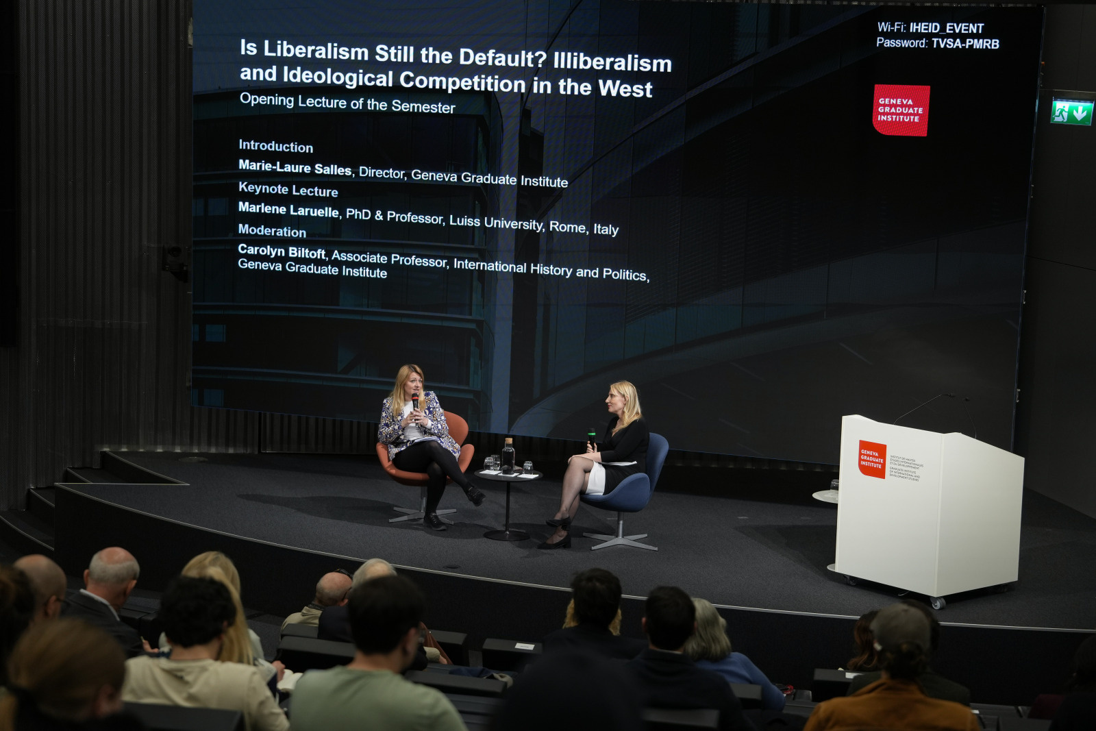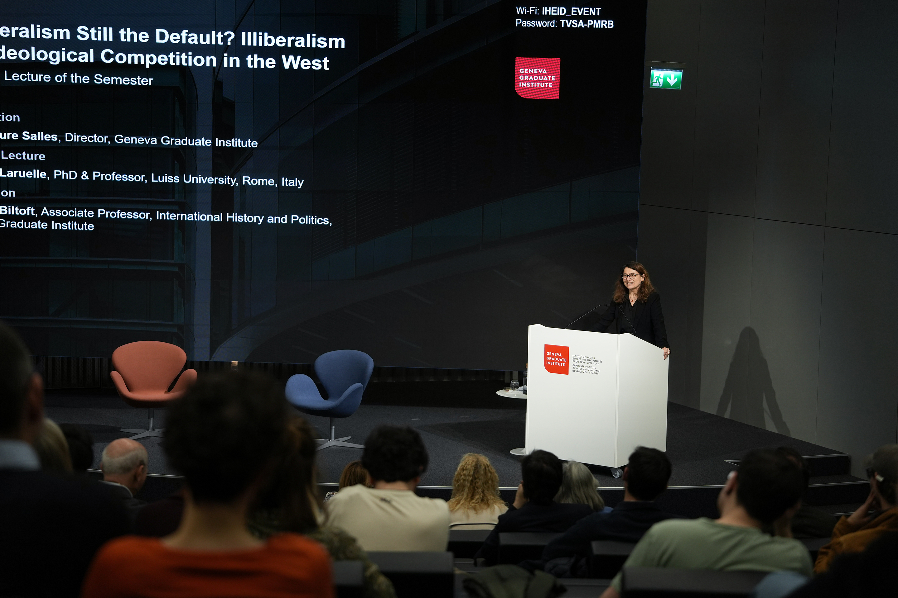 Marie-Laure Salles, Director of the Geneva Graduate Institute, introduced the lecture as well as the context of the “reactionary international” propelling the illiberal wave at the centre of the evening’s discussions: “The unsettling question we are confronted with, in the West in particular, is that of the erosion of assumptions that were, for decades, taken as self-evident. Liberalism is not the default anymore — and an alternative, old-an-new, weltanschauung is coming our way. What are its defining features? And, in parallel, what is it that we wish — and need — to hold on to here in Geneva, the cradle of a certain understanding of humanist universalism and of international collaboration for peace?”