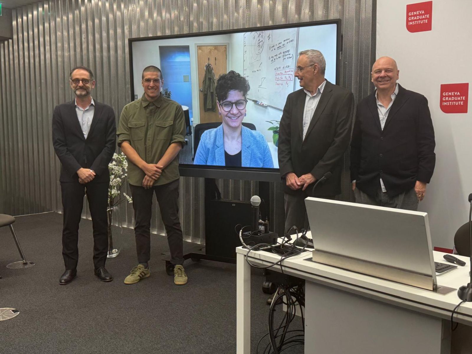On 29 October 2025, Michele Zampa (second from the left) defended his PhD thesis in International History, titled “Essays on Public Investment and Economic Development in Postwar Italy”. He received summa cum laude with special commendations from the committee, which was presided by Professor Ugo Panizza (right) and which included Professor Rui Esteves, Thesis Co-Supervisor (left), Professor Nathan Sussman (second from the right), Thesis Co-Supervisor, and Assistant Professor Réka Juhász, Vancouver School of Economics, University of British Columbia, Canada.