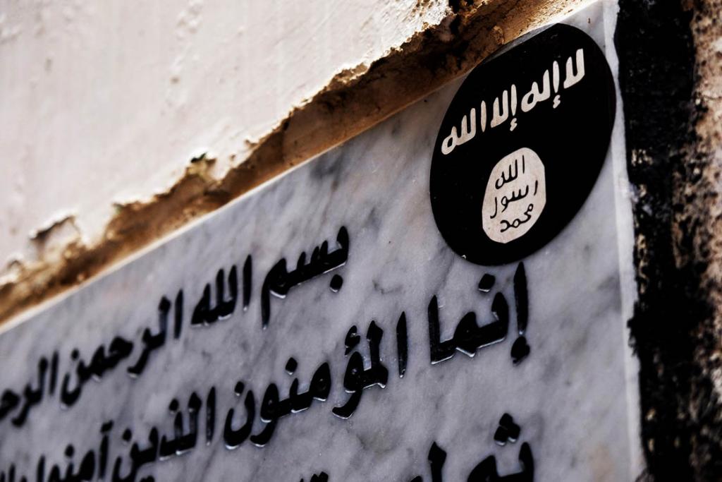 Photo: An Islamic State flag sticker placed on the main plaque of a mosque in Tripoli, Lebanon.