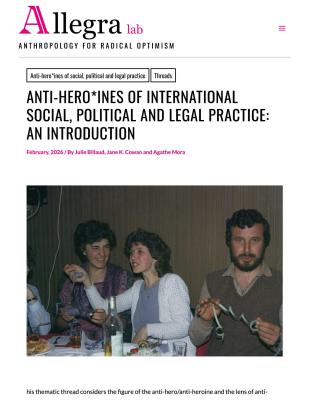 This thematic thread considers the figure of the anti-hero/anti-heroine and the lens of anti-heroism, and proposes a heuristic reformulation, the anti-hero*ine, to grasp more acutely the complexities and ambiguities in the interplay of power, agency and morality in relation to contemporary struggles for justice, rights, and social change. Pursuing this line of enquiry also allows us to reflect on and celebrate the work and scholarship of our friend, colleague and mentor, Jane Cowan. The thread continues a discussion we initiated on the occasion of her Festschrift workshop, 'Anti-hero*ines of International Social, Political and Legal Practice: An International Exploratory Workshop', which took place at the University of Lausanne in June 2024.