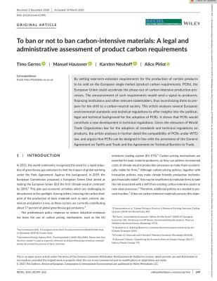 By setting near-zero-emission requirements for the production of certain products to be sold on the European single market (product carbon requirements, PCRs), the European Union could accelerate the phase-out of carbon-intensive production processes. The announcement of such requirements would send a signal to producers, financing institutions and other relevant stakeholders, thus incentivizing them to prepare for the shift to a carbon-neutral society. This article analyses several European environmental standards and technical regulations to offer insights into the political, legal and technical background for the adoption of PCRs. It shows that PCRs would constitute a new development in technical regulations. Given the relevance of World Trade Organization law for the adoption of standards and technical regulations on products, the article analyses in further detail the compatibility of PCRs under WTO law, and argues that PCRs can be designed in line with the provisions of the General Agreement on Tariffs and Trade and the Agreement on Technical Barriers to Trade.