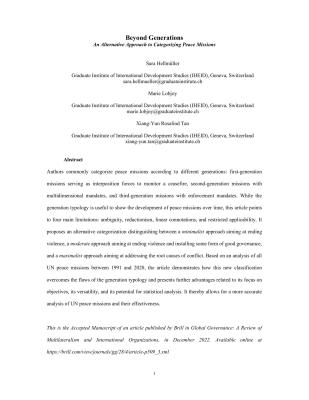Authors commonly categorize peace missions according to different generations: first-generation missions serving as interposition forces to monitor a cease-fire, second-generation missions with multidimensional mandates, and third-generation missions with enforcement mandates. While the generation typology is useful to show the development of peace missions over time, this article points to four main limitations: ambiguity, reductionism, linear connotations, and restricted applicability. It proposes an alternative categorization distinguishing between a minimalist approach aiming at ending violence, a moderate approach aiming at ending violence and installing some form of good governance, and a maximalist approach aiming at addressing the root causes of conflict. Based on an analysis of all UN peace missions between 1991 and 2020, the article demonstrates how this new classification overcomes the flaws of the generation typology and presents further advantages related to its focus on objectives, its versatility, and its potential for statistical analysis. It thereby allows for a more accurate analysis of UN peace missions and their effectiveness.