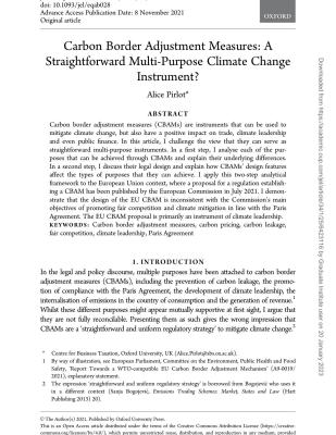 Carbon border adjustment measures (CBAMs) are instruments that can be used to mitigate climate change, but also have a positive impact on trade, climate leadership and even public finance. In this article, I challenge the view that they can serve as straightforward multi-purpose instruments. In a first step, I analyse each of the purposes that can be achieved through CBAMs and explain their underlying differences. In a second step, I discuss their legal design and explain how CBAMs’ design features affect the types of purposes that they can achieve. I apply this two-step analytical framework to the European Union context, where a proposal for a regulation establishing a CBAM has been published by the European Commission in July 2021. I demonstrate that the design of the EU CBAM is inconsistent with the Commission’s main objectives of promoting fair competition and climate mitigation in line with the Paris Agreement. The EU CBAM proposal is primarily an instrument of climate leadership.