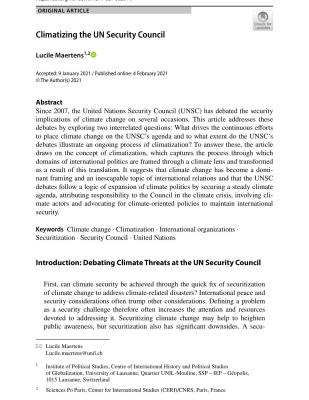 Since 2007, the United Nations Security Council (UNSC) has debated the security implications of climate change on several occasions. This article addresses these debates by exploring two interrelated questions: What drives the continuous efforts to place climate change on the UNSC’s agenda and to what extent do the UNSC’s debates illustrate an ongoing process of climatization? To answer these, the article draws on the concept of climatization, which captures the process through which domains of international politics are framed through a climate lens and transformed as a result of this translation. It suggests that climate change has become a dominant framing and an inescapable topic of international relations and that the UNSC debates follow a logic of expansion of climate politics by securing a steady climate agenda, attributing responsibility to the Council in the climate crisis, involving climate actors and advocating for climate-oriented policies to maintain international security.