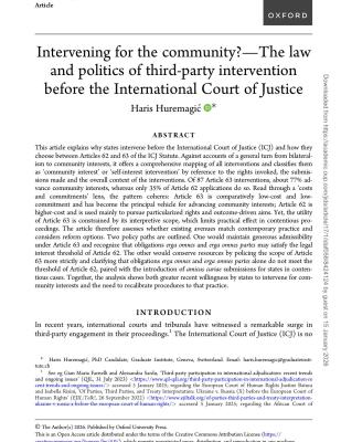 This article explains why states intervene before the International Court of Justice (ICJ) and how they choose between Articles 62 and 63 of the ICJ Statute. Against accounts of a general turn from bilateralism to community interests, it offers a comprehensive mapping of all interventions and classifies them as ‘community interest’ or ‘self-interest intervention’ by reference to the rights invoked, the submissions made and the overall context of the interventions. Of 87 Article 63 interventions, about 77% advance community interests, whereas only 35% of Article 62 applications do so. Read through a ‘costs and commitments’ lens, the pattern coheres: Article 63 is comparatively low-cost and low-commitment and has become the principal vehicle for advancing community interests; Article 62 is higher-cost and is used mainly to pursue particularized rights and outcome-driven aims. Yet, the utility of Article 63 is constrained by its interpretive scope, which limits practical effect in contentious proceedings. The article therefore assesses whether existing avenues match contemporary practice and considers reform options. Two policy paths are outlined. One would maintain generous admissibility under Article 63 and recognize that obligations erga omnes and erga omnes partes may satisfy the legal interest threshold of Article 62. The other would conserve resources by policing the scope of Article 63 more strictly and clarifying that obligations erga omnes and erga omnes partes alone do not meet the threshold of Article 62, paired with the introduction of amicus curiae submissions for states in contentious cases. Together, the analysis shows both greater recent willingness by states to intervene for community interests and the need to recalibrate procedures to that practice.