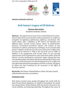 Throughout his ten-year term as United Nations Secretary-General, Kofi Annan pursued reform of the organisation in an effort to strengthen its legitimacy, effectiveness, efficiency, and fairness. This article begins with a definition of UN reform and identifies four different types: Security Council reform, reform of administrative practices, incremental procedural reforms, and creation of new institutions to address contemporary challenges. It next examines Kofi Annan’s initiation of reforms over the course of his term in office, from the time of his selection in 1996 to the end of his term in 2006. In addition to his engagement with all four forms, he also pursued improvement of the organisation in each of the three pillars of the UN Charter: security, development, and human rights, arguing that they were fundamentally interrelated. Kofi Annan believed that reform was a process, and he pursued it not only throughout his term in office but also afterwards through his foundation and other activities. His legacy of reform has been continued by his successors in the Office of Secretary-General.