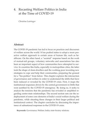 The COVID-19 pandemic has led to focus on practices and discourses of welfare across the world. It has pushed states to adopt a more proactive welfare approach to certain areas of human life, such as healthcare. On the other hand, a "societal" response based on the work of mutual-aid groups, voluntary networks and associations has also been an important aspect of how communities have attempted to survive. In countries like India, especially in metropolitan cities, the latter took the shape of slum-dwellers and the working poor inventing new strategies to cope and help their communities, preparing the ground for a "bio-politics" from below. This chapter explores the intersection of governance and welfare in order to understand the shifts that have been induced or revealed by the COVID-19 crisis. First, it maps the institutional responses driven by the central government in Delhi that were justified by the COVID-19 emergency. By doing so, it seeks to analyse the tensions that the pandemic has revealed or amplified regarding centre-state relationships. The second section sets out the redeployment of some core elements of India’s social welfare during the pandemic, while situating these changes in their larger political and institutional context. The chapter concludes by discussing the importance of subnational responses to the COVID-19 crisis.