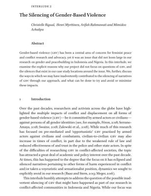 Gender-based violence (GBV) has been a central area of concern for feminist peace and conflict research and advocacy, yet it was an issue that did not loom large in our research on gender and peacebuilding in Indonesia and Nigeria. In this interlude, we examine the explicit reasons why our project did not focus on questions of GBV, and the silences that exist in our case study locations around the issue. We, further, discuss the ways in which we may have inadvertently contributed to the silencing of narratives of GBV through our approach, and what can be done to try and avoid or minimise these impacts.