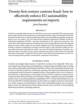Countries increasingly adopt measures to make their economy more sustainable. These measures range from pricing carbon and protecting forests to promoting renewable energy and banning forced labour. This article examines how countries can effectively enforce such sustainability requirements on imports. Based on two case studies—the EU Carbon Border Adjustment Mechanism (CBAM) and the EU Deforestation Regulation (EUDR)—and other developments in EU customs law and practice, this article shows that customs inspection of elements that cannot be physically detected in the imported product as such is neither unique nor new. Similar challenges arise when dealing with massive inflows of small e-commerce consignments or having to check the origin or value of products. Indeed, for customs enforcement more generally, the trend is one away from physical inspection of products on a transaction basis at the point of entry, toward verification and control of firms before and especially after release of the goods. To implement this ‘product-to-firm’ shift, four back-up features are, however, crucial, focusing on data, penalties/circumvention, cooperation, and resources.