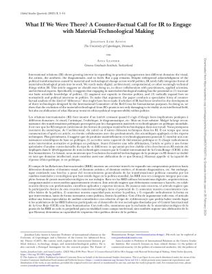International relations (IR) shows growing interest in expanding its practical engagements into different domains: the visual, the artistic, the aesthetic, the diagrammatic, and so forth. But a gap remains. Despite widespread acknowledgment of the political transformations caused by material and technological change across world politics, IR rarely fully integrates forms of material-technological praxis into its work. We rarely make digital, architectural, computational, or other seemingly technical things within IR. This article suggests we should start doing so, in direct collaboration with practitioners, applied scientists, and technical experts. Specifically, it suggests that engaging in material-technological making has the potential to (1) increase our basic scientific knowledge of politics, (2) augment our capacity to theorize politics, and (3) radically expand how we normatively and political intervene in politics. To make that argument, the paper conducts a speculative form of counter-factual analysis of the kind of “difference” that might have been made if scholars of IR had been involved in the development of three technologies designed by the International Committee of the Red Cross for humanitarian purposes. In doing so, we show that the exclusion of the material-technological from IR’s praxis is not only damaging to its vitality as an intellectual field, but also an abdication of what Haraway terms its ethico-political response-ability within politics.