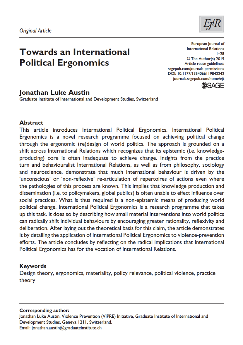 This article introduces International Political Ergonomics. International Political Ergonomics is a novel research programme focused on achieving political change through the ergonomic (re)design of world politics. The approach is grounded on a shift across International Relations which recognizes that its epistemic (i.e. knowledge producing) core is often inadequate to achieve change. Insights from the practice turn and behaviouralist International Relations, as well as from philosophy, sociology and neuroscience, demonstrate that much international behaviour is driven by the ‘unconscious’ or ‘non-reflexive’ re-articulation of repertoires of actions even where the pathologies of this process are known. This implies that knowledge production and dissemination (i.e. to policymakers, global publics) is often unable to effect influence over social practices. What is thus required is a non-epistemic means of producing world political change. International Political Ergonomics is a research programme that takes up this task. It does so by describing how small material interventions into world politics can radically shift individual behaviours by encouraging greater rationality, reflexivity and deliberation. After laying out the theoretical basis for this claim, the article demonstrates it by detailing the application of International Political Ergonomics to violence-prevention efforts. The article concludes by reflecting on the radical implications that International Political Ergonomics has for the vocation of International Relations.